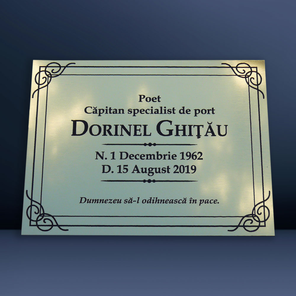 Material: ABS argintiu, culoare auriu , imprimarea este realizat prin gravură laser. ABS-ul este un material multistrat de producție americană, având o rezistență foarte bună la intemperii în orice condiții meteo fără pierderea luciului și culorii originale. Sunt ideale pentru cruci metalice și nu numai. Se pot comanda la orice dimensiune. Oferta de preț este pentru modelele cele mai căutate.